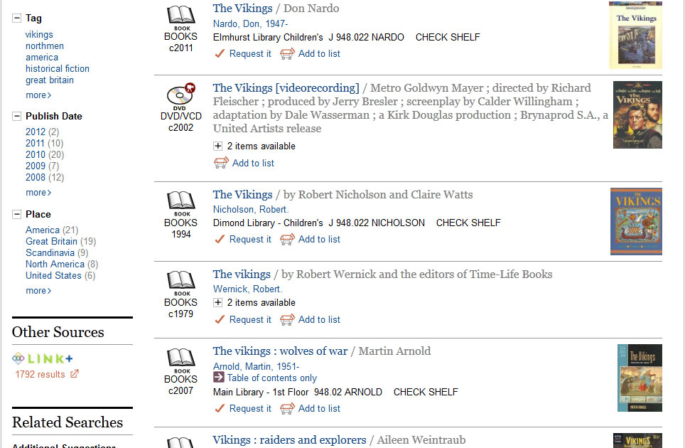 To use LinkPlus, go ahead and search the library’s online Encore catalog like always, and look for the LinkPlus results under “Other Sources” in the left column, below the lists of locations, languages, etc.