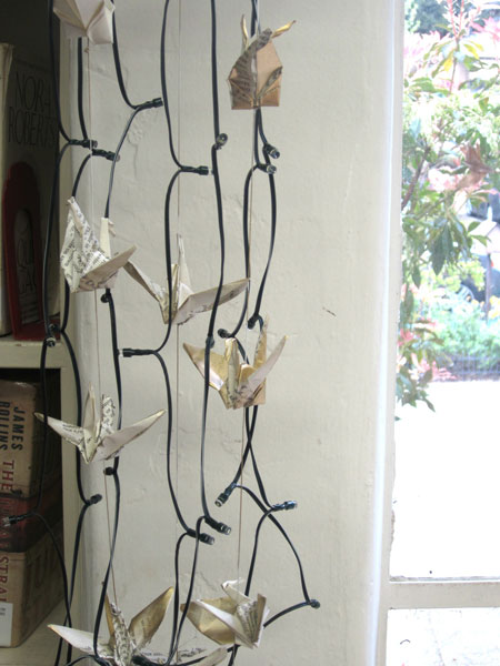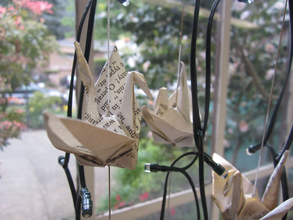 In the Teen division, Mollie S. took top honors with her mobile titled “The Flight of Words,” featuring gilded paper cranes folded from book pages, hanging from the book body along with solar-powered string lights. Our judges liked the lights and the fact that the cranes are peace symbols folded from a book about war (“The Guns of Navarone”).