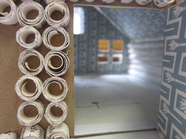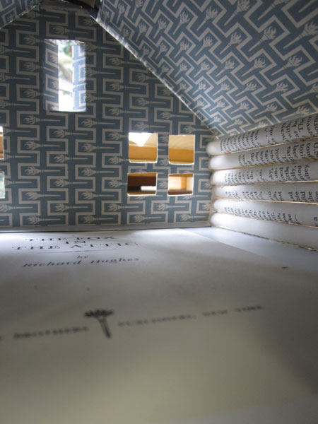 In the Adult division, first place went to Kamni Vijay, who built her piece, “Log Cabin,” using quilled book pages to represent logs and the book’s cover as the roof. Inside, the the walls are papered with the book’s endpapers and the floor is the title page. Our judges loved that she used almost every part of the book, and the sweet little bird peeking out the front window. It looks like someplace Johanna Spyri’s Heidi would feel at home.