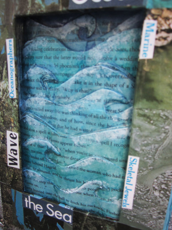 In the Adult division, first place goes to Audrey Larsen’s “Dive into a Good Book!”, which combines a carved out Harry Potter book with images from The Ocean World of Jacques Cousteau to create a “window into the ocean.”