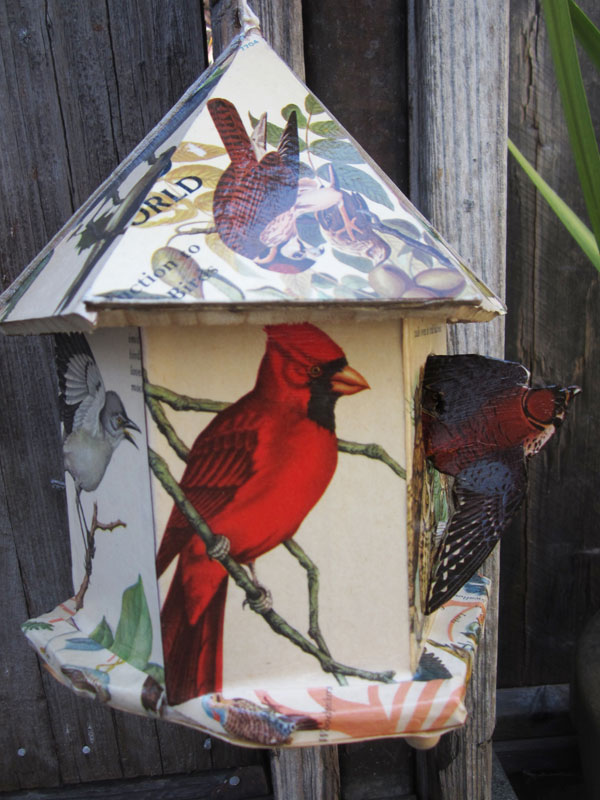 In the Kids (ages 5-12) division, the judges were wowed by first place winner 12-year-old Elena’s “Home for Vintage Birds.” Made from a damaged birdhouse covered with pages and covers from Birds of the World, the piece illustrates, in Elena’s words, that “Old or damaged, a home is still a home.”