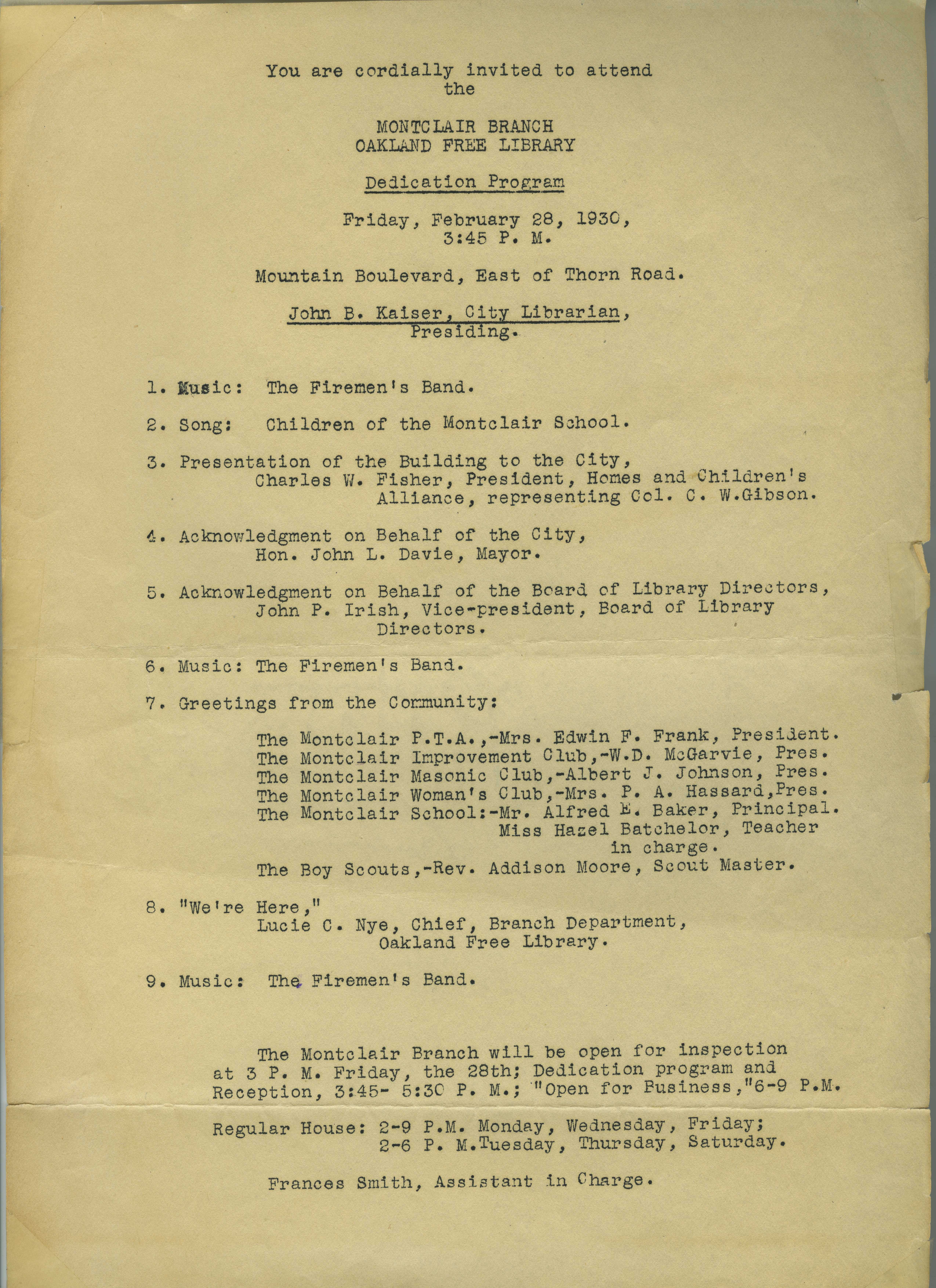 Here’s one last treat from the event: A photo of the original program from the library’s dedication ceremony on February 28, 1930:
