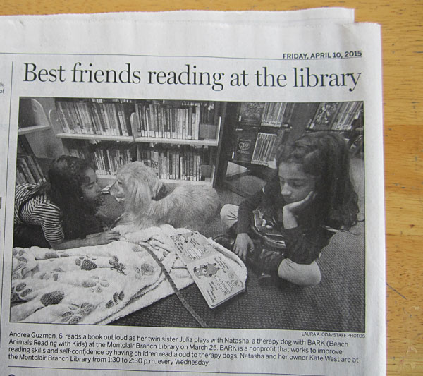 The Montclair Library was all over this week’s issue of The Montclarion, including a note about the branch’s history in Annalee Allen’s “Landmarks” column, an article about our friends, the Hillside Gardeners’, upcoming Garden Tour, and a sweet photo of kids reading to Natasha the BARK therapy dog.