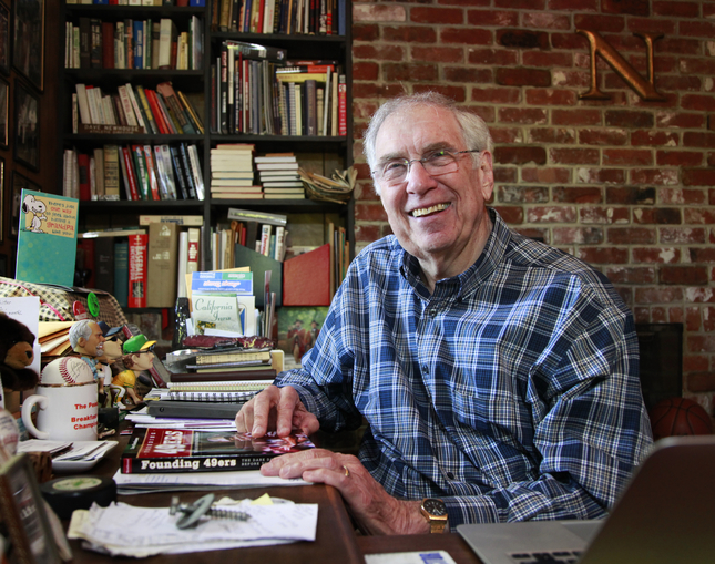 Former newspaper columnist and sports writer Dave Newhouse at his home in Oakland, Calif., with his newest book “Founding 49ers: The Dark Days Before the Dynasty” on Monday, July 27, 2015. (Laura A. Oda/Bay Area News Group)