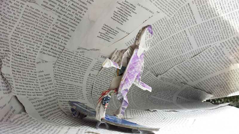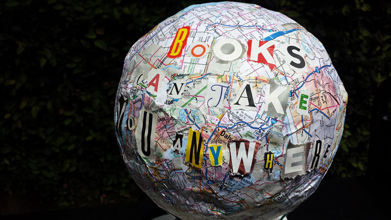 First place in the Kids’ division goes to Edain B., whose “Books Can Take You Anywhere” piece features a papier-mache hot air balloon lifting off from a book.