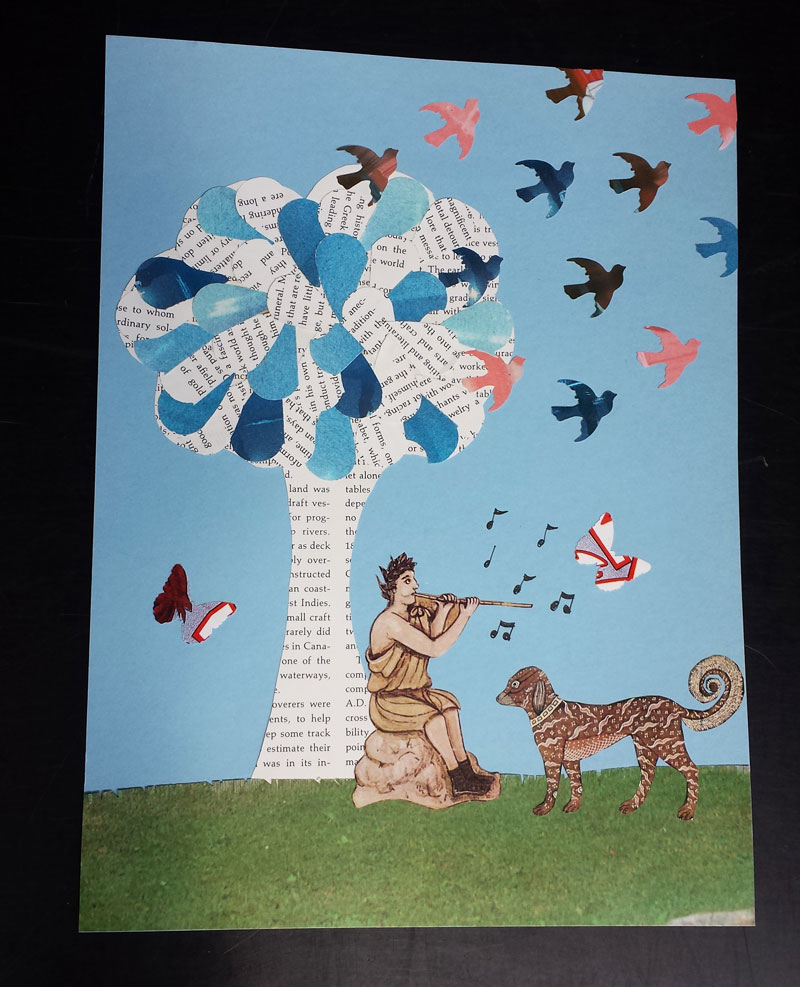 In second place, Ginnie Brooks collaged pages from books about ancient Greece into “Music in the World.”